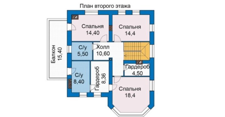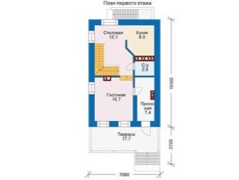Стълбищната зала в една от тези опции заема 3.22 кв. м на първия и 2.28 кв. м – на втория етаж. Площта на верандата долу и балкона на горния етаж са идентични. Използвайте вестибюл с площ 2,75 кв. m е доста удобно. Освен това на долния ред има: