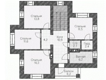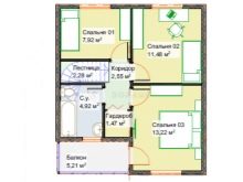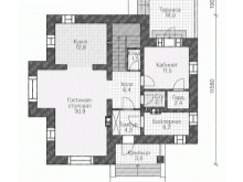 В една от тези схеми хол и трапезария са комбинирани, което води до стая от 30,9 квадратни метра. м. Кухнята с площ от 12,8 м2 ви позволява успешно да приготвяте всяка храна, дори за сравнително голямо семейство и гости. Можете да оборудвате офис за тези, които трябва да работят у дома, гардероб и баня. Има и котелно помещение. На втория етаж спалните са благоприятно допълнени от баня, тоалетна и 6.2 кв. м.