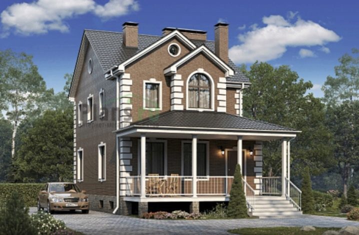 За малък парцел можете да разгледате и варианти с сутерен. Например, един от тях е специално проектиран за тясна зона.. Архитектите умишлено са използвали такова усъвършенствано и оригинално решение като еркер.
