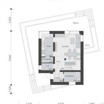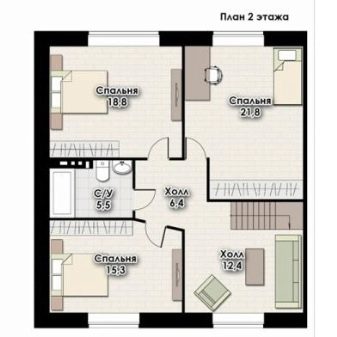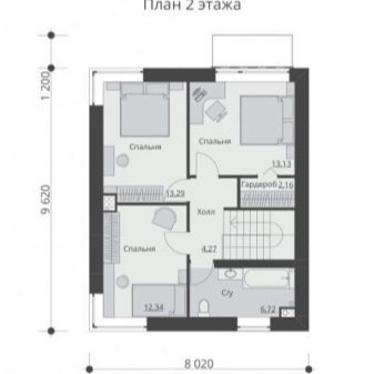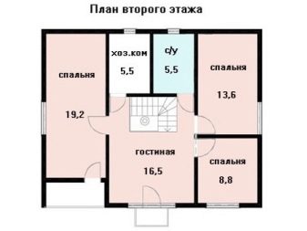 Струва си да се обмисли оформлението на къща 10×8 m с височина 2 етажа. Може да побере и 3 спални. Общият брой стаи се увеличи на 5. Други важни нюанси: