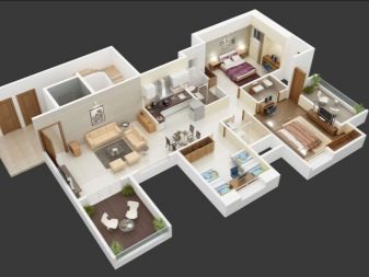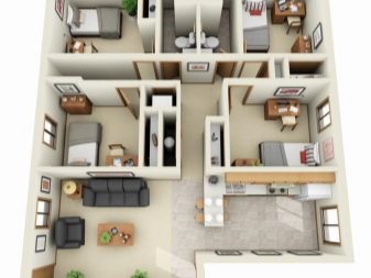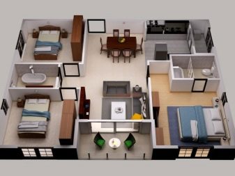 Три спални могат да бъдат разположени на приземния етаж. Изграждането на спални с площ над 20 м2 е нерационално. Според статистиката, 16 м2 пространство е достатъчно за човек, а 20 – повече от. Тогава оформлението на къща с един етаж включва 3 спални по 20 м2 – 60 “квадрата”. Останалите 36 кв. м нежилищна площ може да бъде разпределена, както следва: