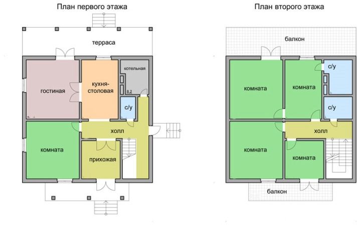 Ако говорим за схема от два пълноценни етажа, тогава оформлението на първия етаж от предишната версия може да се повтори на втория.. Тази функция ще позволи на две семейства да останат в една двуетажна къща. За второто семейство входът на втория етаж може да бъде направен отделно-пълноценно стълбище до една от носещите стени над входа на първия етаж.