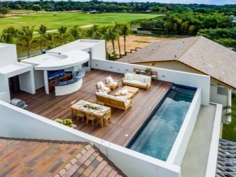 Участието на плосък покрив е ограничено само от финансите на собственика. Ако няма средства за огромни басейни и хеликоптерни площадки, на покрива може да се постави жива морава. Тук са монтирани и дървени повърхности, върху които са поставени беседки, градински мебели и дори изкуствени камини..