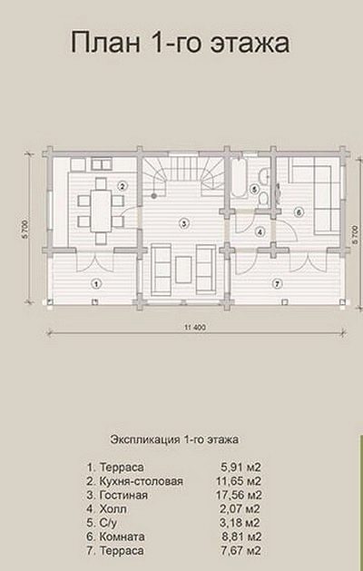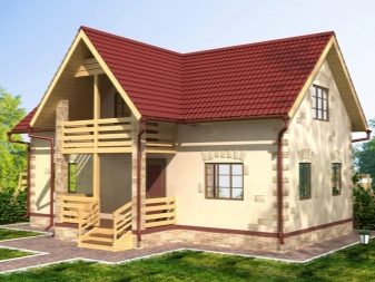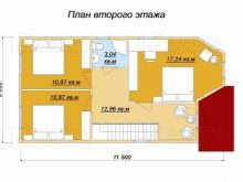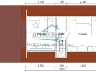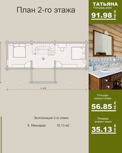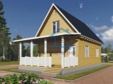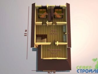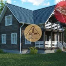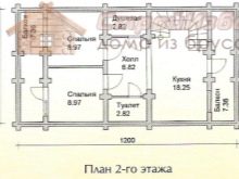 Има две спални по 11 кв. метра и зала от 14 кв. м. На това ниво има достатъчно място за семейство с деца.. Дачата може да бъде построена от залепени греди или заоблени трупи. Вторият вариант е идеален за тези, които не искат да харчат много пари за интериорна декорация, тъй като естествените греди изглеждат доста естетически и оригинални в интериорния дизайн.