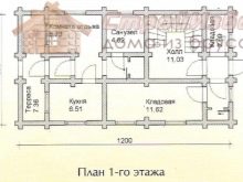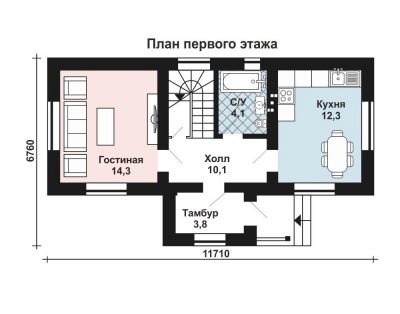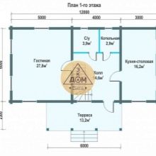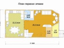 От предверието влизате в малка зала, водеща до банята за гости 4.1 кв. м, кухня 12.3 м2 и хол 14.3 кв. метри. Ако семейството се събира главно в кухнята и не се очакват голям брой гости на вилата, можете да превърнете хола в спалня или да оборудвате офис там.. Така ще се окаже, че ще използвате пространството с максимална функционалност..