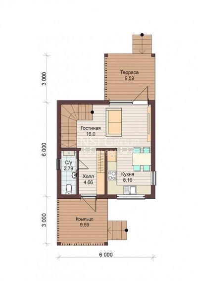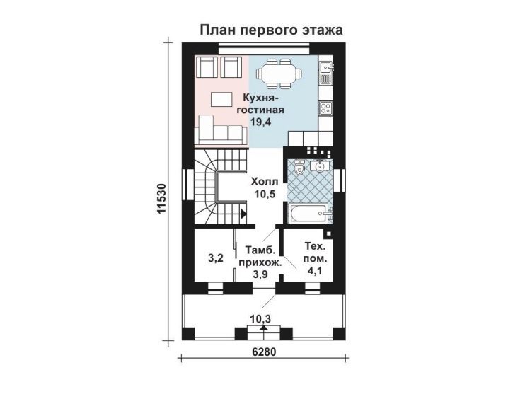 Входът на жилището минава през 10,3 квадратна тераса, на която можете да поставите няколко плетени стола и масичка за кафе, за да прекарате време там през топлите летни вечери. Малко входно антре от дясната страна има вход към котелното помещение 4.1 квадратни метра и към съблекалня 3.2 метра през плъзгащи се плъзгащи се врати. На входа на основната част на къщата, от дясната страна има голяма баня, а след това има просторна площ от 19,4 кв. м, включително хол и кухня.