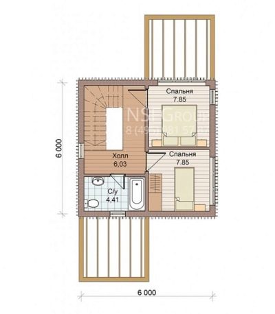 Стълбището, водещо към втория етаж, води към антрето на 6 метра. Има две спални от 7.8 квадратни метра и баня от 4.4 м2.. Най -добрият вариант за семейство с едно дете.