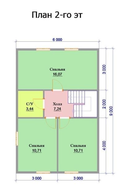 Стълбището води към антрето на втория етаж с площ 7,2 кв. м. Има баня от 3,4 м2 и три спални. Най -голямата главна спалня, 16,7 квадратни метра, се намира вдясно от стълбите, другите две са по 10,7 квадратни метра всяка. метра – вляво. Големият плюс на толкова много стаи е, че една от тях може да се приема като офис или стая за игра.