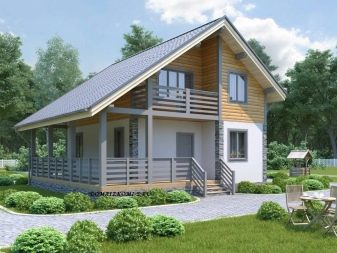 Обикновено тези къщи имат широка тераса, на която се планира да прекарва много време през лятото. Сградата ви позволява да създадете допълнителна зона за отдих и да увеличите използваемата площ. Входът към жилищните помещения е през терасова конструкция.