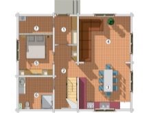 Класическият едноетажен план на къщата, изработен от ламиниран фурнир, е чудесен за малко семейство. Всички най -важни стаи се намират до входа: