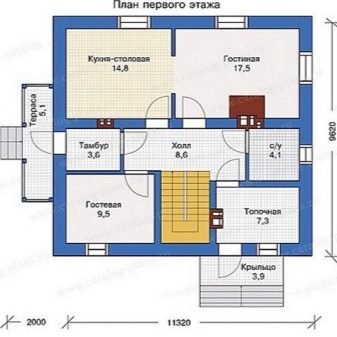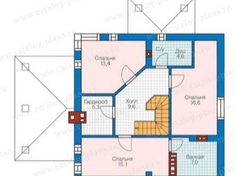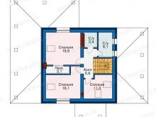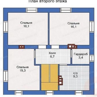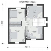 Размерът на стълбищната зала в тавана е около 4.48 кв. м. Осигурена е много голяма (над 12 м2) баня. Лесно е да подредите солидна баня и впечатляващ тоалетен блок там. Спалните са 12, 14 и 17 кв. m съответно. Тази опция не може да се похвали с нищо по -специално..
