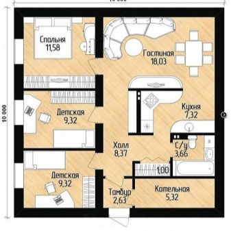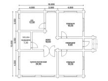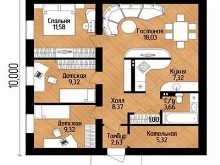 Можете да построите едноетажна къща 10×10 m от труп с три спални, ако отидете на някакъв трик – само дизайнът на тавана. Тези, които влизат в жилището, първо се оказват в двуметрово преддверие. Оттам могат да отидат в залата, която е свързана с гардероба. След това, в най -отдалечените от входа ъгли, има баня и огромна (повече от 31 кв. М.) кухня и всекидневна..