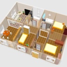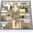 От предверието и тесния коридор е лесно да влезете в комбинирана стая, която служи като трапезария, хол и кухня наведнъж. Вратите от тази стая водят към спалните, а оттам вече можете да стигнете до балкона. На противоположния ъгъл на къщата има тераса..