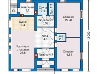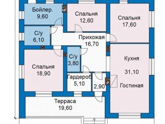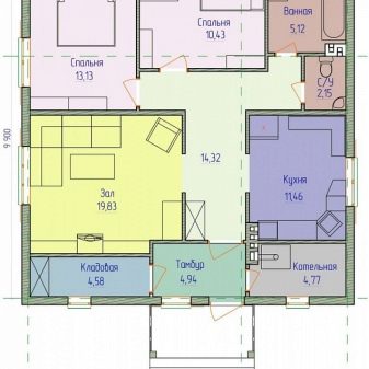 Премахването на отоплителни уреди и устройства в отделна стая е напълно разумно. Това решение ви позволява да осигурите оптимален комфорт и в същото време да опростите подреждането на отоплителните системи. В тази схема се откроява 4-метрова котелна, разположена в ъгъла. Можете да стигнете до там от предверието, две други врати, от които се стига до складовото помещение и коридора. След като минават по този коридор, те се оказват или в коридора, или в една от спалните, или в банята или тоалетната.