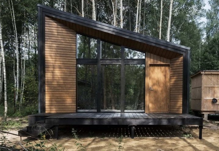 Добър вариант би била такава малка къща 6х5, декорирана в модерен стил, с черен или тъмно сив покрив с големи панорамни прозорци..