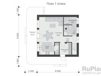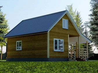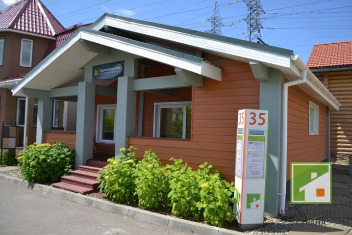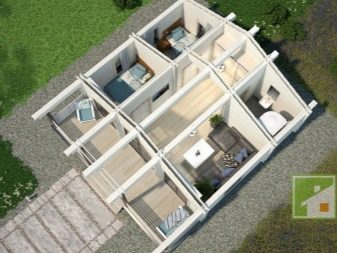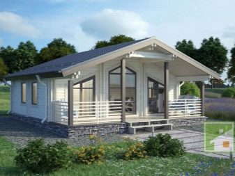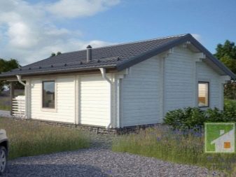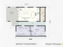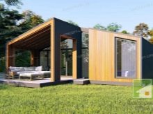 Основната характеристика на това жилище е голяма Г-образна тераса, където можете безопасно да поставите плетени градински мебели, декорирайки я с цветни меки възглавници и комплект за хранене за семейни събирания за закуска и вечеря.. От малък вестибюл можете да влезете в котелното помещение и в самата къща, която се състои от хол с площ от 25,8 квадратни метра и кухня от 12,4 квадратни метра. метри. Малка баня от 3,2 м2 ще побере мивка, тоалетна и душ. Сградата отвътре прилича на едностаен апартамент. Това ще бъде добър вариант като къща за гости, разположена до основната на голяма територия..