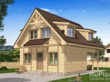 Този проект може да бъде направен и от дървена къща. Основната характеристика на къщата е голяма тераса от 25,5 кв. метра, на които свободно могат да се поберат плетени мебели и кът за хранене. По-голямата част от първия етаж е заета от кухня-хол с обща площ 31 м2. Също така на това ниво има спална стая от 9,3 кв. м и баня от 5.6 кв. метри. В тавана има две спални по 12 и 25 квадрата, съблекалня (4,5 м2) и баня (6,9 м2).