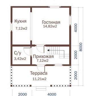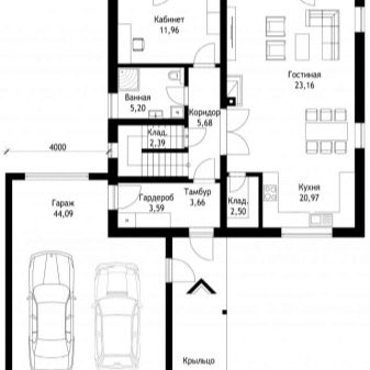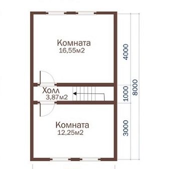 Няма следи от зала, тук не се наблюдава входна врата. Входът, както в студио, директно в стаята от двора. Тук няма въпрос за устройство за игра или детска стая. На втория етаж, на тавана, може да се подреди склад и спортна стая. Същата стая (за спорт) се превръща в спалня за гости. Гостът може да бъде настанен отделно или, ако гостът е в напреднала възраст, да му даде стая на приземния етаж и да се качи горе, за да прекара нощта.