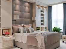 Спалня от 16 м2 без излишни украшения. Тук можете да инсталирате разтегателен диван, телевизор, гардероб за ежедневни дрехи, бельо и спално бельо. Пасва и на бюфет, малка маса и чифт сгъваеми столове.