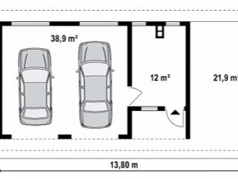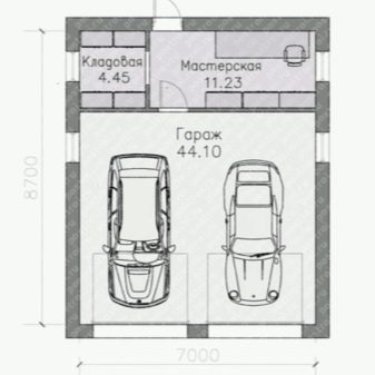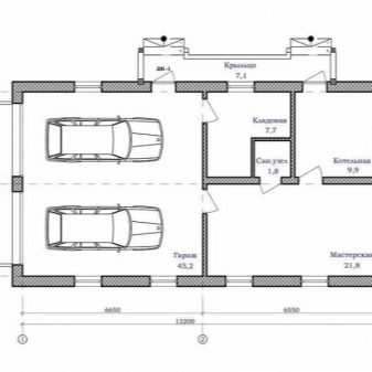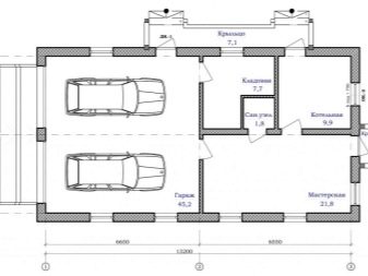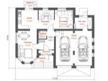 Проектите на малки къщи с два гаража са много търсени. Оптималното решение в този случай е класическа къща и малък гараж с един вход. Планът предвижда няколко вентилационни прозорци, има малко място за стелажи. Такъв гараж се издига върху лента тип основа, външната декорация и покривният материал могат да бъдат избрани за общия стил.