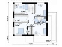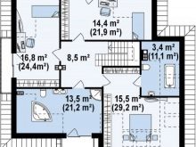 Ако пространството на сайта позволява, можете да опитате да построите гараж с таванско помещение и дори да проектирате мини баня там. Размерът на терасата зависи единствено от размера на обекта и вашите възможности. Два прозореца – в гаража и в банята – задължителни моменти. Можете да направите две врати към банята – от гаража и от терасата.
