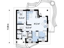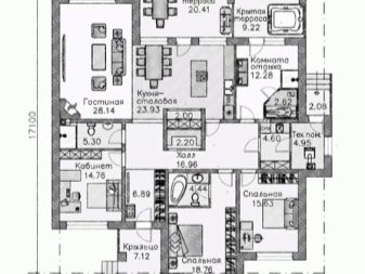 Къщи до 200 кв. м. също могат да бъдат рамкови и такива проекти не са по -лоши от другите опции. Струва си да се обмисли например решение с балкон, еркер и тераса с обща площ 176 кв. 15-метровата кухня е директно свързана с 38-метровата зона за гости (авторите умишлено са изоставили преградите между тях). От верандата можете да влезете в преддверието, а оттам – в гардероба. Баня от 7 м2 е достатъчна за основни хигиенни процедури; има също зала, складово помещение и тераса.