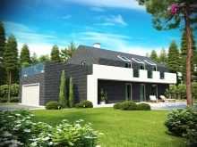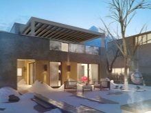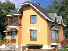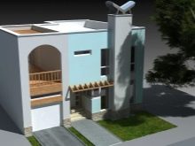 Една от тези опции е изпълнена в средиземноморски стил. Предвижда подреждане на 3 спални, 3 бани, тераса и дори гараж. Размерът на залата със стълбище е 29,7 кв. м., а на приземния етаж има 3-метрова баня.