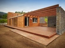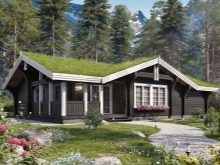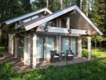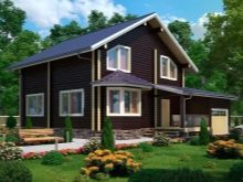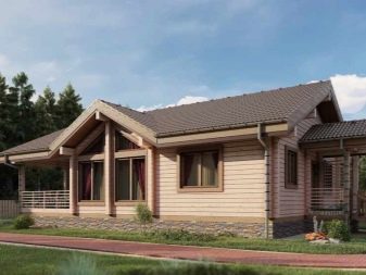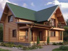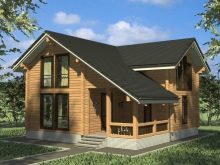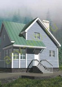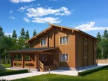 Друга възможност ви позволява да допълвате хоризонталната греда с няколко вертикални елемента. Използването им придава специален аромат на сградата. Покривът също изглежда много привлекателен и дори незабравим. Както дървената веранда, така и покритата тераса се използват умело. Къщата като цяло изглежда стилно на фона на зелена морава.