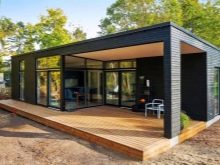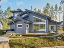 Къщите с покрив със сложна форма, съставени от по-прости блокове, могат да изглеждат много привлекателни. Контрастът на светли и тъмни дървени елементи на фасадата също е отлично дизайнерско решение. Терасите и балконите значително ще повишат комфорта на такъв дом. Можете също така да построите къща, която е просто удължена по дължина, в която се използват както прости, така и сложни покривни секции. Тук бяха оборудвани тераси с огради и сенници.