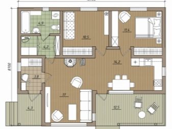 Една от концепциите предвижда подреждането на открита тераса с размер 12,5 кв. м. Размерът на банята е 3,8 кв. м. Размерът на другите зони е равен на:
