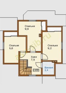 Друг начин за оборудване на пространството е показан на диаграмата по -долу.. Неговата приятна особеност е 4-метровата веранда. От него хората влизат в залата на същия площад, оборудвана с втора светлина. Двуметровата баня не е особено впечатляваща, но се справя успешно със своята функция. Размерът на кухнята и жилищната площ е 24 м2; на тавана са оборудвани само спални и антре.