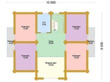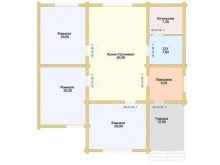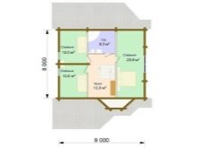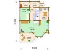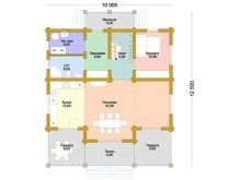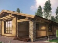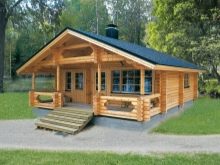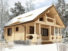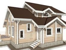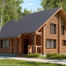 Малка дървена къща в стил зимна хижа с площ от 136 квадратни метра. Не е с много големи размери, заема парцел от 12х12 м. Изглежда доста представително и в същото време уютно. Може да се използва и през зимата, тъй като е оборудван с котелно помещение. От малка тераса попадаме в квадратно антре с прозорец, а оттам в голяма кухня-хол. И вече от хола вратите водят към три спални и баня.