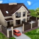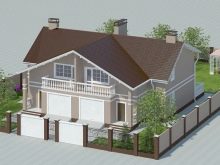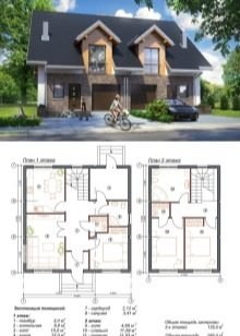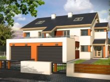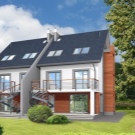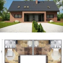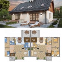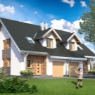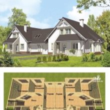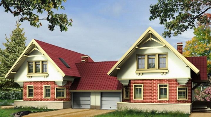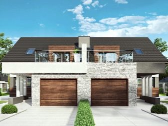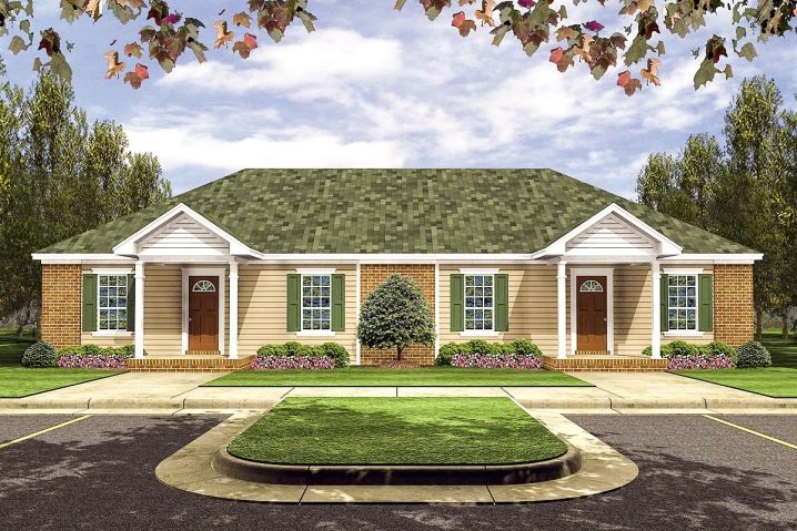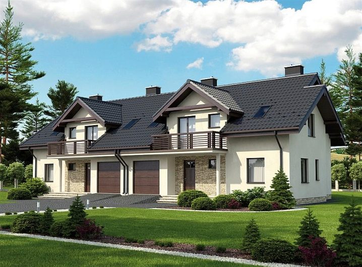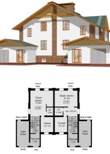 Едноетажна двуфамилна къща с таван изглежда много уважавана. Благороден вид ще му дойде с графичен покрив на фона на бели стени и тухлена вложка от облицовъчни тухли по фасадата. Въпреки малката площ, наличието на таванско помещение направи възможно сградата да бъде снабдена с вградени гаражи.