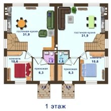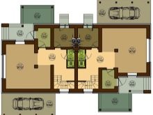 - В следващия проект на едноетажна къща за 2 семейства са запазени принципите на огледално оформление. Входните зони са разположени възможно най -далеч – те са разположени отстрани на сградата и са оборудвани с веранда. И в двете половини кухнята-трапезарията осигурява достъп до обща тераса, разделена от носеща стена.