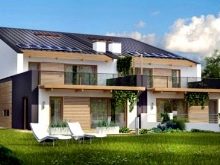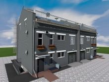 Великолепен сглобяем дуплекс в стил хижа. Проектът осигурява много светлина и изглежда ефирен поради панорамни прозорци на първия и полу-таванския етаж. В същото време оформлението ясно разделя жилищните помещения и гарантира поверителност за двете семейства. Това се улеснява от участък, разделен с решетъчна ограда. Сградата има тераси и балкони.