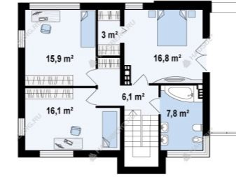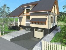 Уместно е да завършите историята с още една опция. Тя включва подреждането на 20-метров гараж. Площта на зоната за гости е почти 34 кв. м. Размерът на коридора е 12 квадратни метра. м. На последния етаж има няколко спални, има и „втора светлина“.