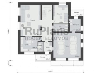 Вариантите за двуетажни къщи с гараж под един покрив могат да бъдат доста различни. Например, много интересно решение е, когато нивото на мазето е запазено за котелното помещение и за няколко различни по големина мазета, чиято цел варира по ваша преценка. Самият гараж в този проект се намира на приземния етаж и заема 36 кв. м. От 4-метровата веранда влизащите влизат в 8-метровия коридор.