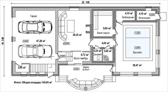 Хол и гардероб са разположени по краищата му.. В 6-метровата баня има всичко необходимо за цялостни хигиенни процедури. Кухня 12 кв. м. ви позволява да се наслаждавате на готвенето. Площта на хола достига 28 кв. м. Гаражът има отделен вход, не можете да стигнете до него от къщата. Къща със сауна и гараж също трябва да се разглежда непременно. Тази опция включва малък (около 2 кв. М.) Душ. Зоната за сауна също е малка – малко повече от 4 “квадрата”. Размерът на съблекалнята е същият като този на парната баня. За релаксация след процедури за баня тук се разпределят около 10 м2..