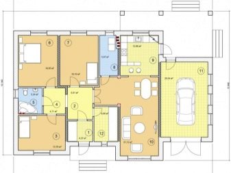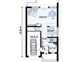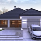 План на къщата заедно с гараж от 29,5 кв. m се оказва доста прилично решение. Можете да стигнете до и от колата през отделен вход. Прилежащото пространство е подходящо за организиране на относително малка тераса.. От 12-метровия коридор е лесно да се влезе в общото помещение, чийто размер надвишава 31 кв. м. Диаграмата показва и наличието на голям брой други помещения, чието предназначение може да бъде променено по ваша преценка..