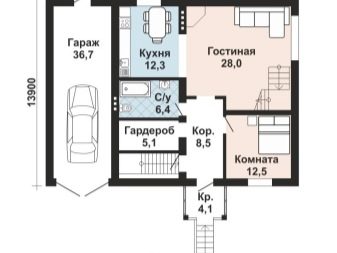Вариантите за двуетажни къщи с гараж под един покрив могат да бъдат доста различни. Например, много интересно решение е, когато нивото на мазето е запазено за котелното помещение и за няколко различни по големина мазета, чиято цел варира по ваша преценка. Самият гараж в този проект се намира на приземния етаж и заема 36 кв. м. От 4-метровата веранда влизащите влизат в 8-метровия коридор.