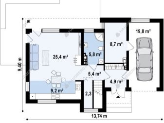 Има и друг вариант – този път с гараж от 19,8 кв. м. Размерът на зоната за гости достига 25,4 м2. Площта на вестибюла е 2,3 “квадрата”. Около 9 “квадрата” бяха взети под трапезарията. Страни на къщата – 13,74 и 9,4 м. На втория етаж спалните са разпределени по размер: