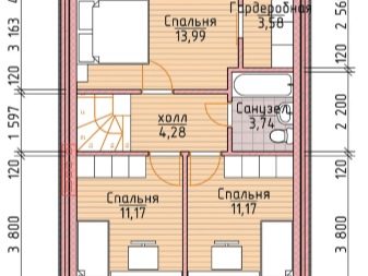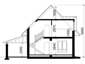 - Две стаи на приземния етаж – основното помещение и залата, съответно 9,7 и 5,8 м2. Душът се поставя в залата само когато вратата към основната стая е по -близо до началото, а не до края на стаята..