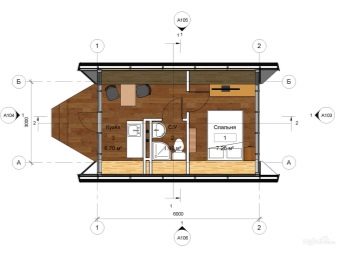 - Къщата на един етаж е с полезна площ от 20 м2. Не изисква капитална лентова основа – инсталира се само върху колонно -монолитни опори.
