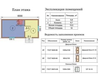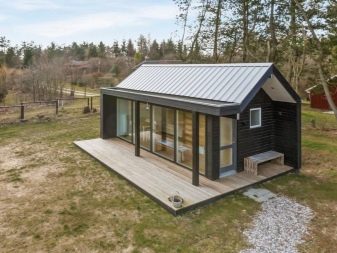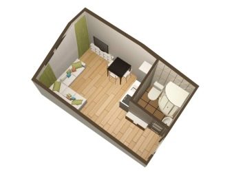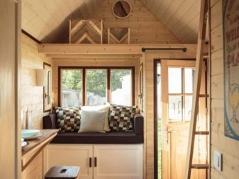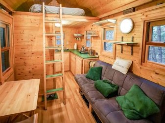 Оформлението на къщата е просто: на приземния етаж има предверие и баня с кухня-хол, на втория има спалня. Едноетажната версия е подобна на миниатюрен студиен апартамент – пространство от 6 * 3 м е зонирано в спалня, кухня, но е трудно да се постави душ, може да се наложи отделна баня, прикрепена към къщата. Това решение надхвърля 18 м2. Предприемчивите собственици, след като закупят завършена сграда, възстановяват едноетажна сграда в двуетажна. Покривът най-често е едноскатен или фронтон, тъй като си струва да се направи четирискатен покрив само в случай на организиране на таванско помещение.
