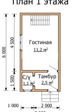 - Вътрешен душ – 1,1 м2, вестибюл – 2,5 м2, хол – 11,2 м2. Втори етаж – спалня от 13.7 м2. На мястото проектът заема своите 18 м2 – заедно със стените.