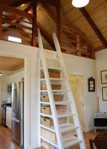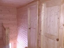 - Дървено стълбище на входа – дървен материал 9 * 13 см, настилка – три сантиметрова (по дебелина) дъска.