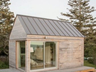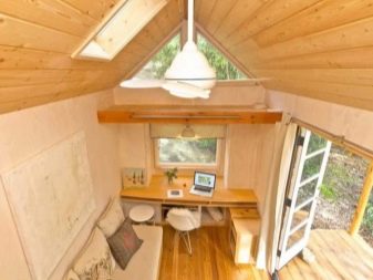 Възможно е да се оборудва таванско помещение под формата на мецанин само когато покривът е двускатен. На практика, когато живеят заедно, тази опция често се изоставя, заменяйки таванското помещение с пълноценен втори етаж. Таванско помещение за такива миниатюрни къщи е неразумен разход, затова се препоръчва незабавно да се построи втори етаж. В този случай дебелината на стените трябва да бъде най -малко една и половина до две тухли – “сто и петдесет”. Като материали за градински дървени къщи – греди, трупи и дъски. Дачата, на мястото на която има къща от дърво или тухла, изглежда модерна и днес.