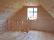 - Тавански етаж – с височина до 2,2 м, конструкция от бар с разрез 4 * 10 см. Обшивка от дъска – със същата дебелина като на първия етаж. Затоплянето и хидроизолацията са еднакви.