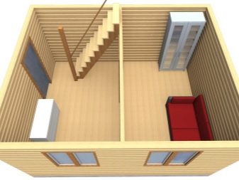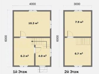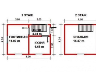Успешните проекти на къщи 4х6 метра трябва да бъдат внимателно обмислени. Например, допълнителни измервателни уреди могат да бъдат издълбани, като се свърже стаята за гости с кухнята или като се направи стълбището към таванския етаж възможно най -малко. На горното ниво е разумно да се подредят няколко компактни спални, които няма да се разхождат. Особено интересни са опциите за къщи, в които основата се заменя с купчини.