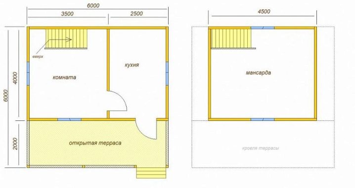 Има голям брой възможности за проекти на къщи 4 на 6 метра, от които е лесно да се избере подходящата за всякакви изисквания. Например, ако сайтът е твърде малък или не искате да променяте оформлението му, тогава можете да изберете сграда с таван или мецанин. Най -често такива конструкции се издигат от бара.. Такава дървена мини-къща ще бъде много просторна отвътре поради пространството на тавана..